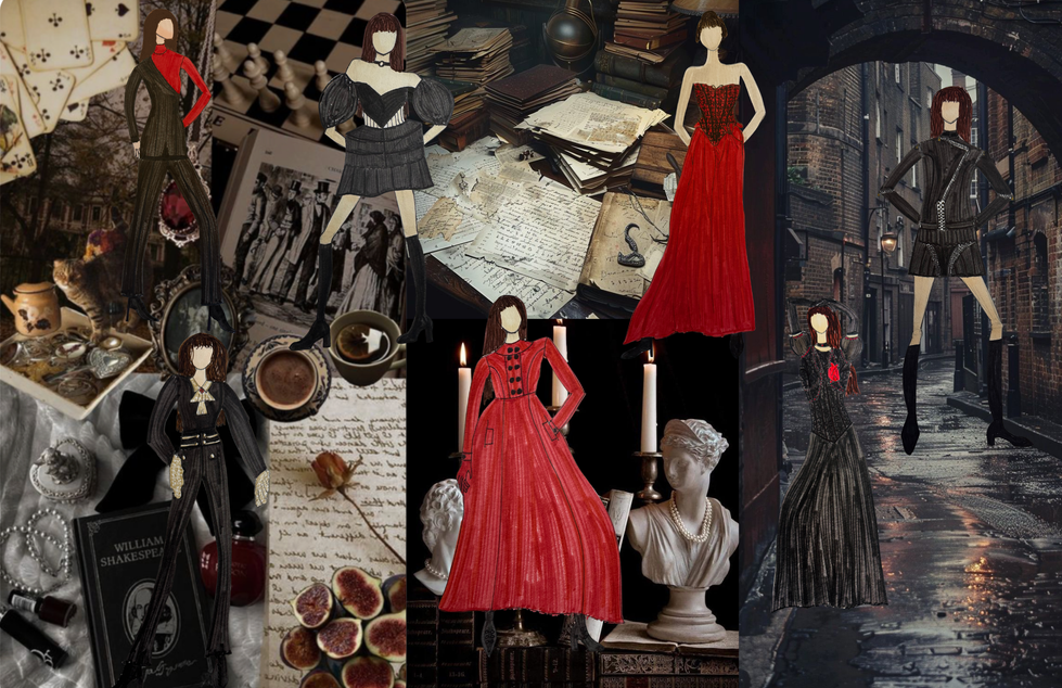 Visually, the collection draws from dark academia, blending tailored structure with delicate textures. Corsetry, lace blouses, and layered silhouettes move together like the pages of an unfinished novel. A palette of oxblood, ink black, and aged ivory evokes candlelit libraries, worn manuscripts, and forgotten love letters.